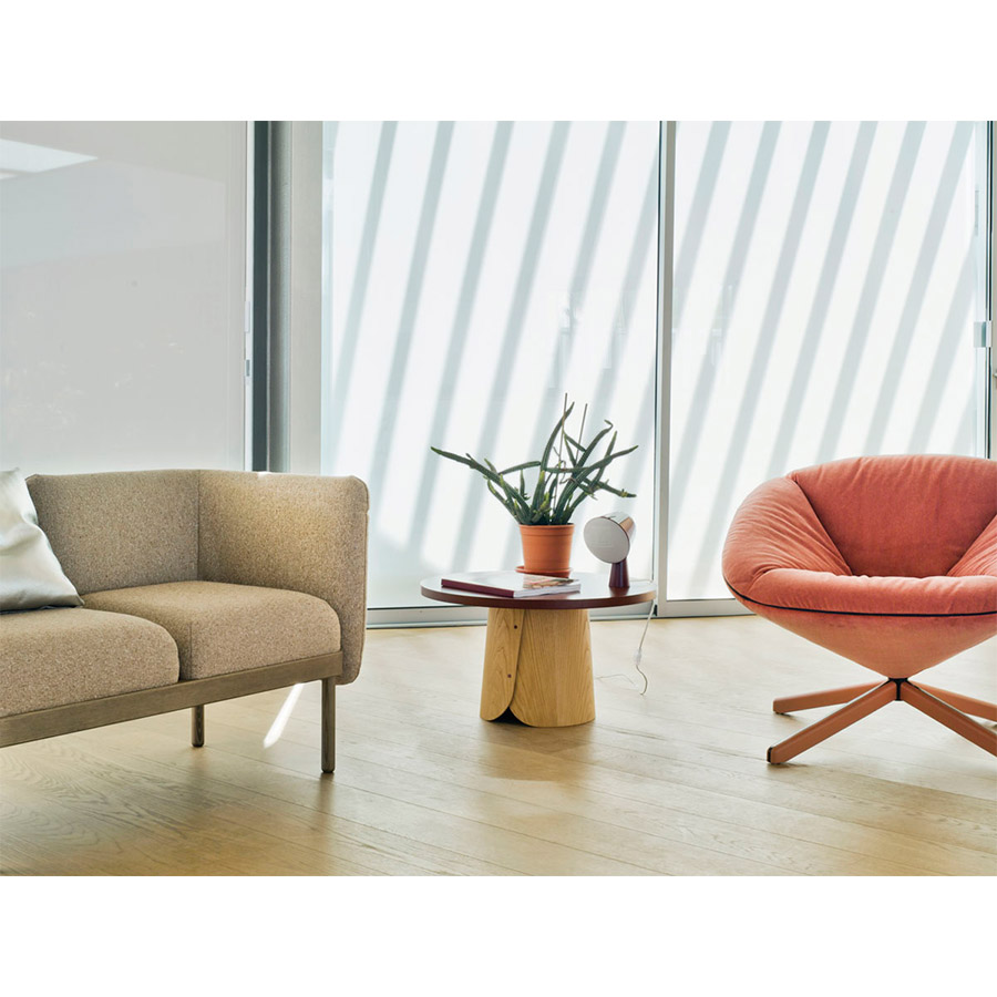 Tab son 2 banquetas con diferente altura y 4 mesas. La base siempre es de chapa de castaño curvada y las tapas están disponibles en chapa de castaño y en un amplio abanico de lacados.