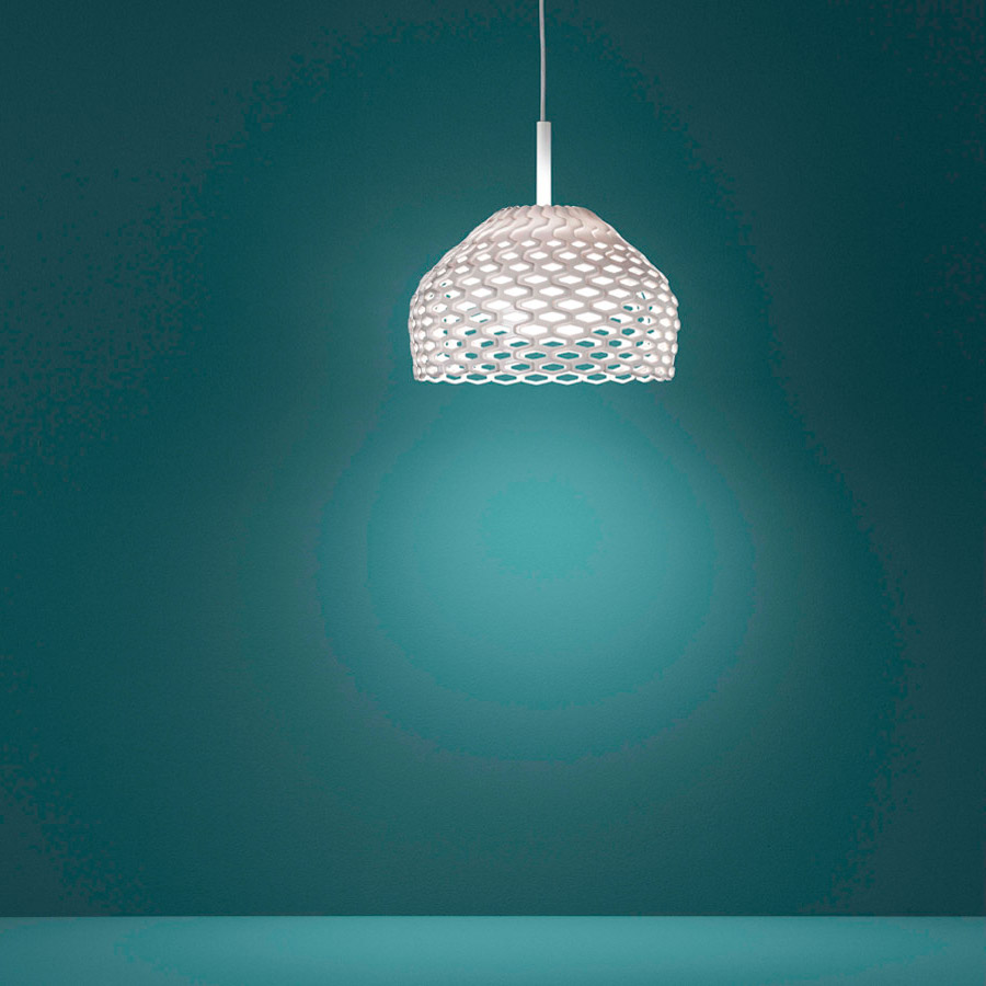 La lámpara de mesa Tatou de Flos, diseñada por Patricia Urquiola, se inspiró en una antigua armadura japonesa. La sombra de la 'carcasa' de las luces protege la luz directa a los ojos y produce un juego armónico de luces y sombras a través de las secciones perforadas. Es a la vez un elemento decorativo y un práctico producto de iluminación.