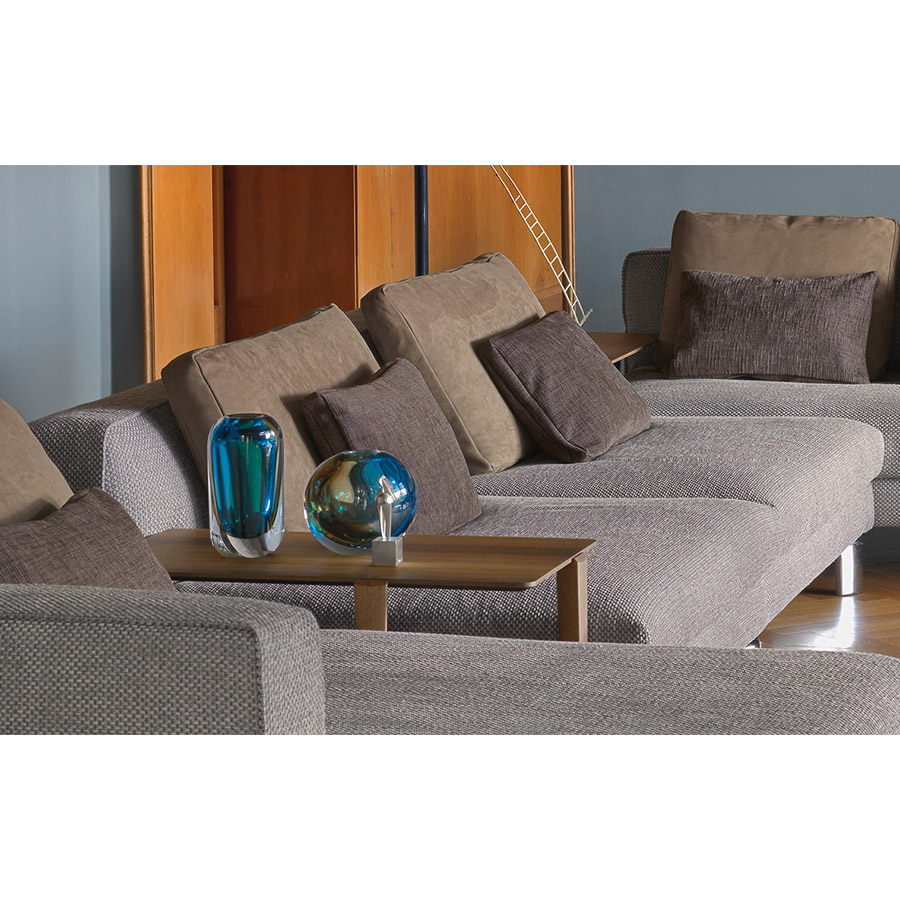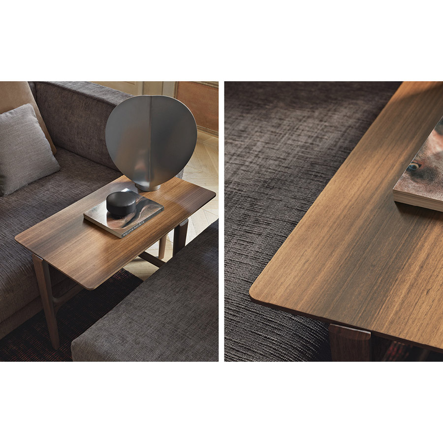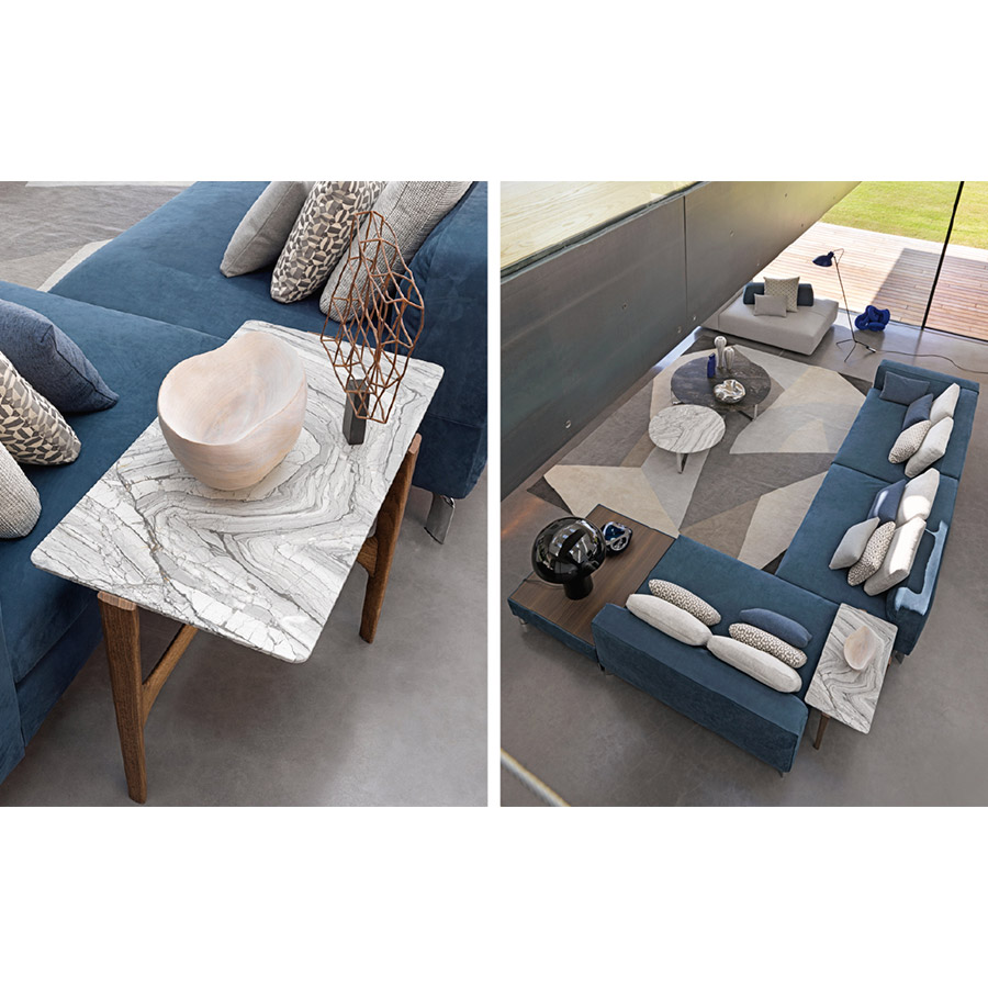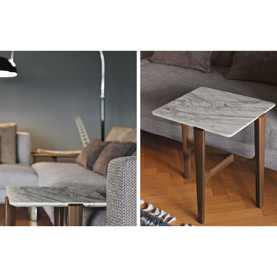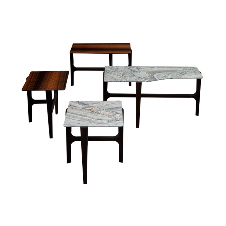 Massimo CastagnaMesitas con estructura en madera maciza de eucalipto pulido opaco. Top de 20 mm biselado en los bordes, disponible en madera de eucalipto pulido opaco o mármol.