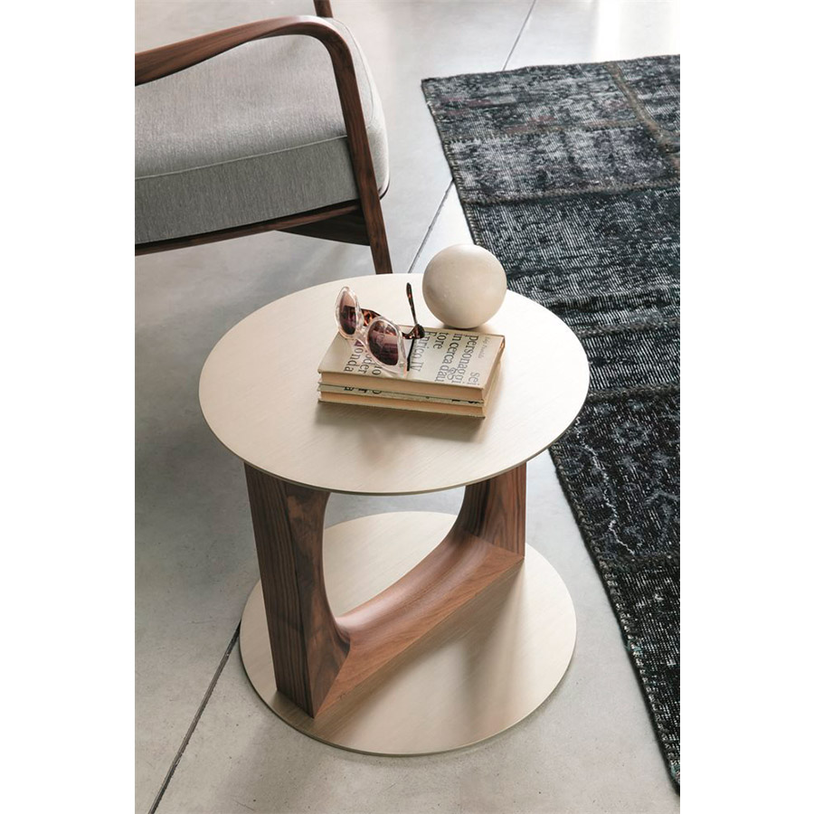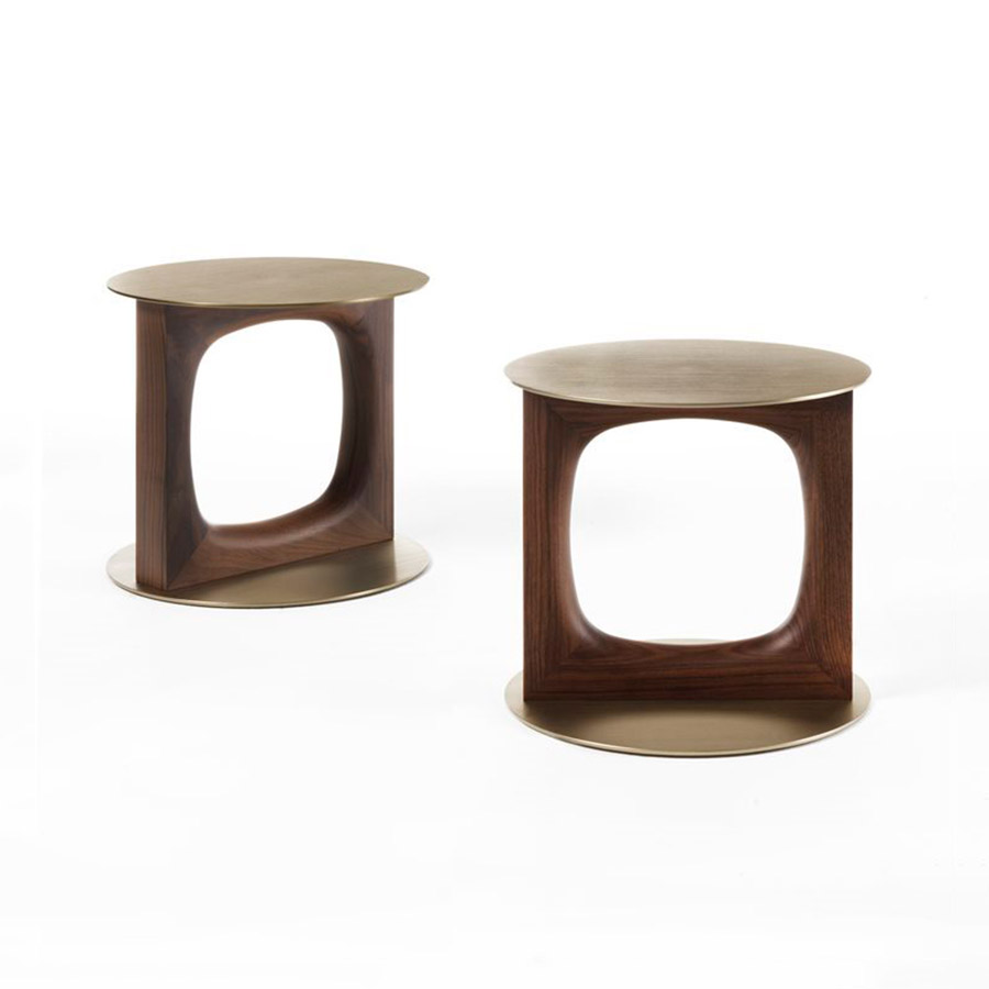 C. BallabioMesa auxiliar con soporte central de nogal canaletta macizo y tapa y base en metal en acabado latón cepillado. Diametro 45x41H