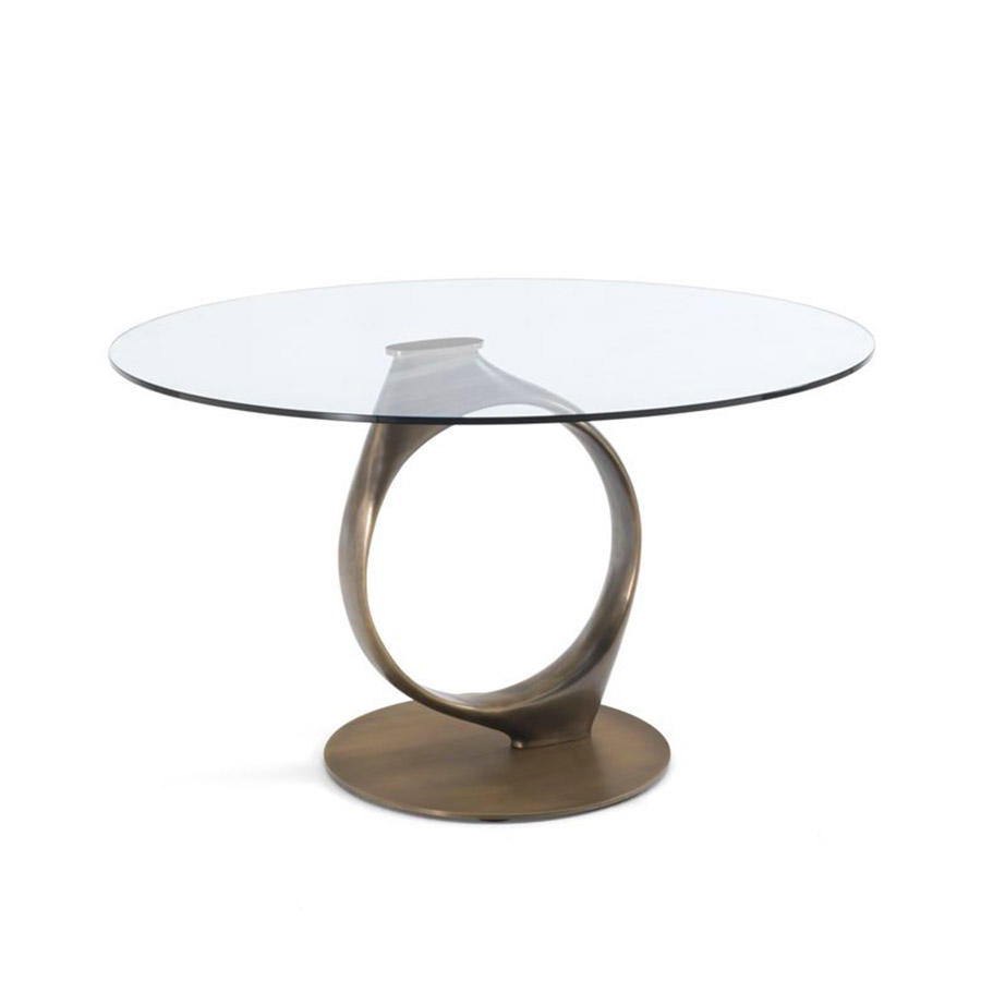 S. BigiMesa redonda con base central en fundición de latón bronceado montada encima de un disco de metal en acabado latón bronceado y tapa de cristal templado (espesor mm. 12). La base se realiza de un molde único, destruido después de la fundición. Es posible grabar el nombre del cliente en la base.