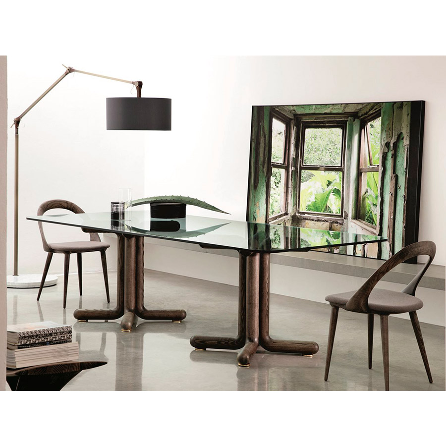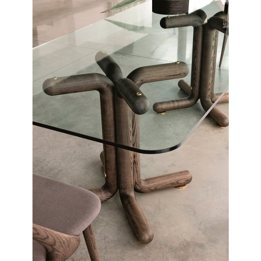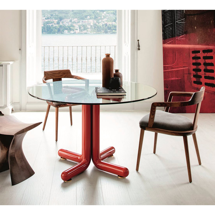 EssetipiMesa de comedor con base de fresno o nogal canaletta macizo o lacada brillo y tapa redonda de cristal templado transparente. Pies de latón cepillado. Disponible en redonda, diametros 120 – 130 – 140 – 150 – 160