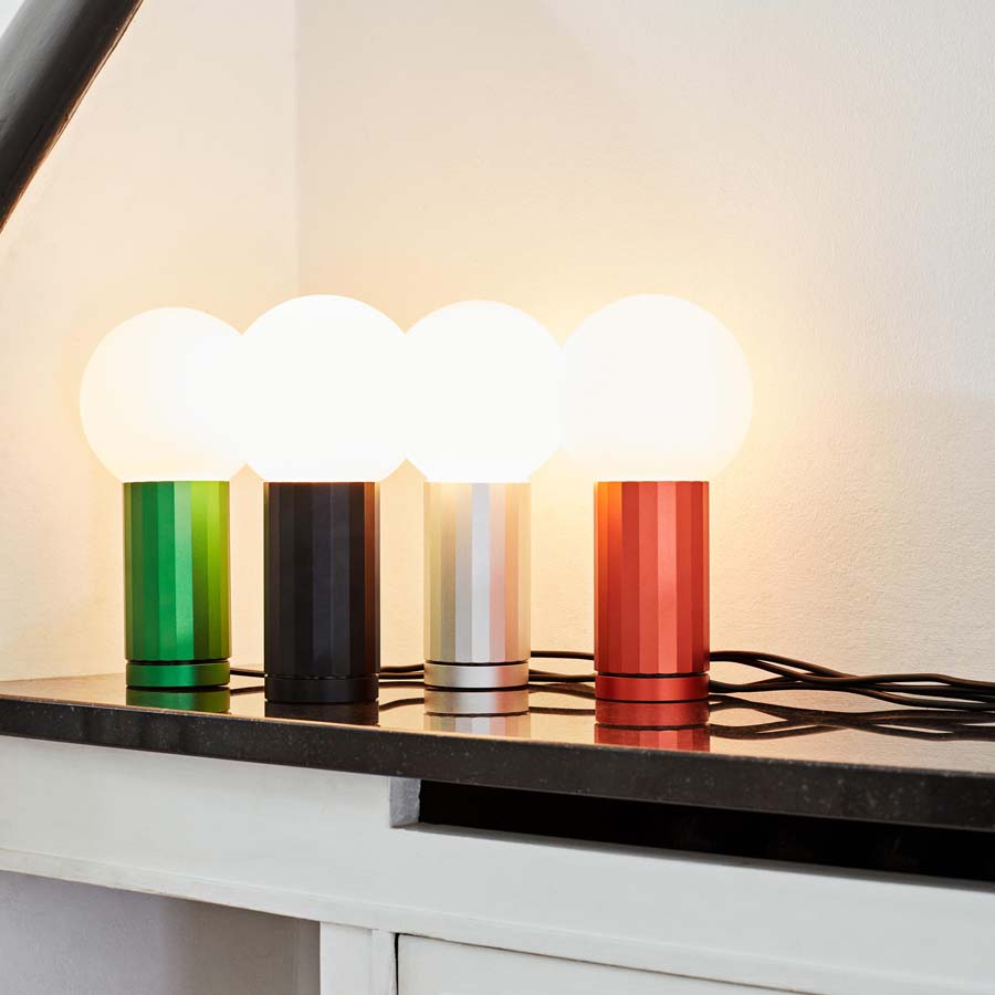 Una pieza de diseño bellamente unificada hecha de aluminio y vidrio opalino. La base es un cilindro facetado que funciona como interruptor de luz y como vástago que sujeta el difusor esférico de vidrio en su lugar. Al girar la base en el sentido de las agujas del reloj, se enciende la luz LED y una mayor rotación aumenta la salida de lúmenes. Este movimiento integrado en el diseño permite al usuario aumentar o atenuar la luz de forma intuitiva. La base se presenta en cuatro acabados anodizados: negro, aluminio, naranja o verde. Turn On es un diseño hecho a escala humana, sencillo y agradable al tacto.