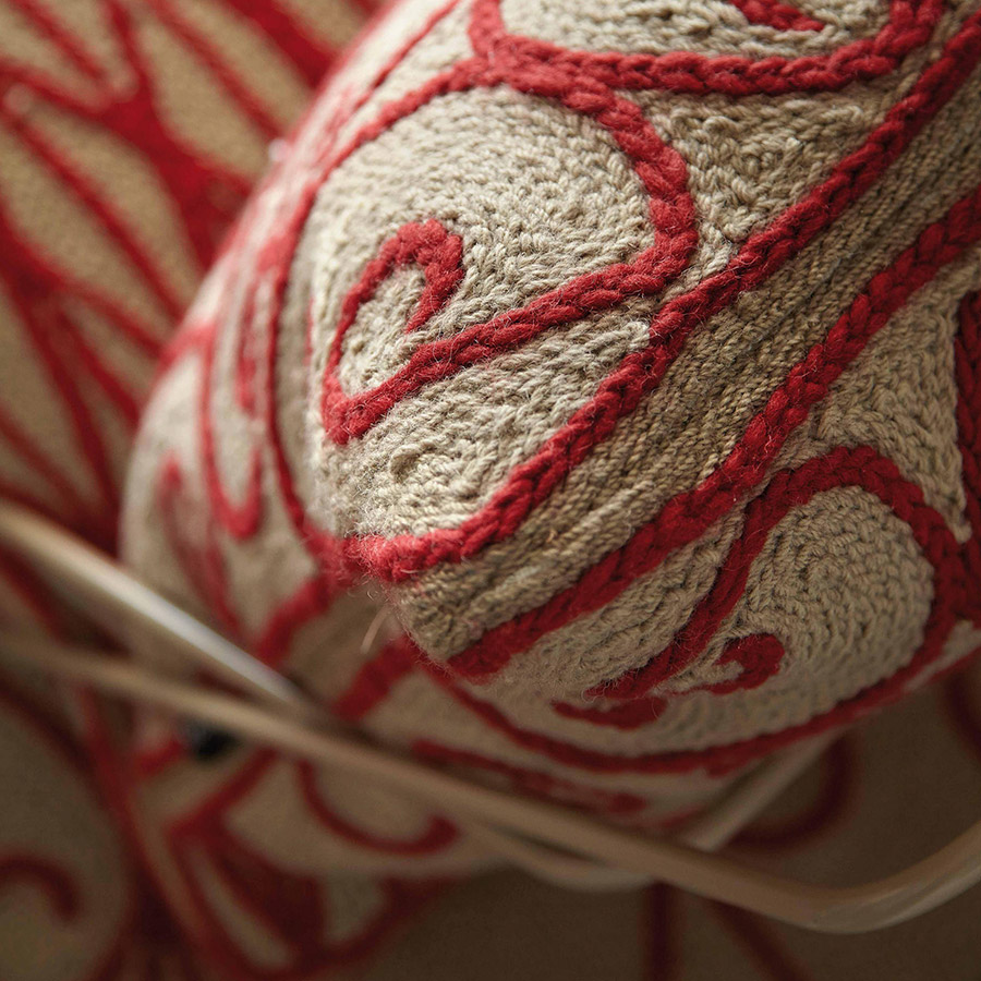 Esta es la butaca a ras del suelo de nuestra colección Valentina, un diseño concebido con tan solo dos cojines y una liviana estructura de varillas de acero. El tejido que recubre tanto el cojín que hace de asiento como el que funciona de respaldo, tiene una textura y un tono marrón claro similar a los de las artesanías elaboradas con esparto. Sin embargo, está confeccionado enteramente con 100% lana virgen, incluido su motivo en color crudo que recuerda a los tradicionales adornos de las rejas de forja artística.
