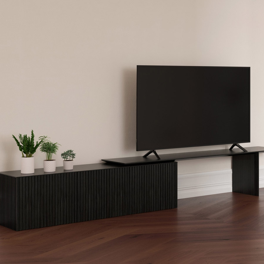 Ludovica + Roberto PalombaUn mueble de TV arquitectónico, lineal y minimalista, no exento de elementos de calidez. La madera es protagonista en su esencia y en el detalle de las puertas caracterizadas por un patrón vertical que denota tridimensionalidad a un objeto esencial.