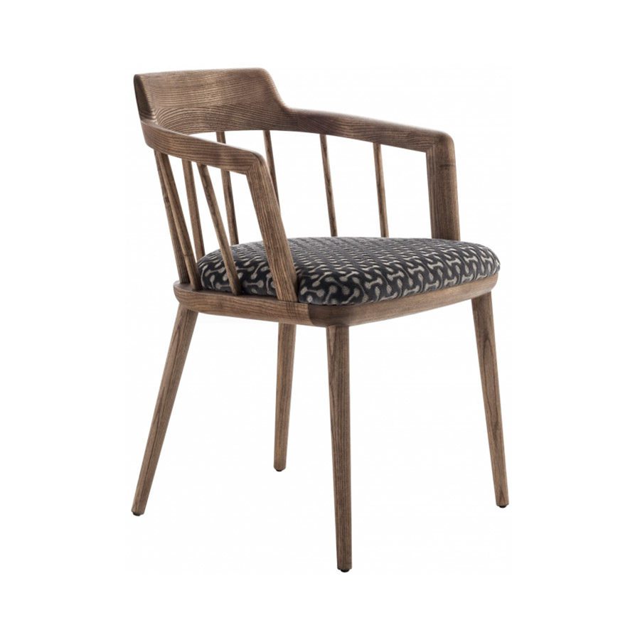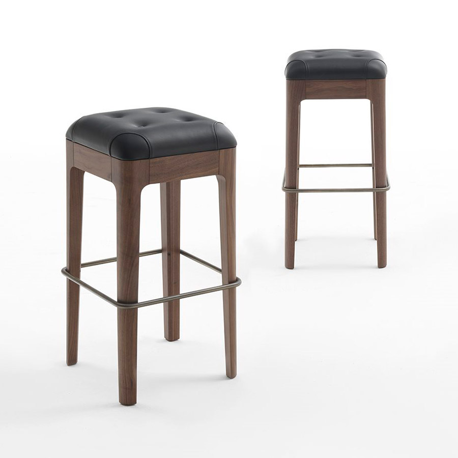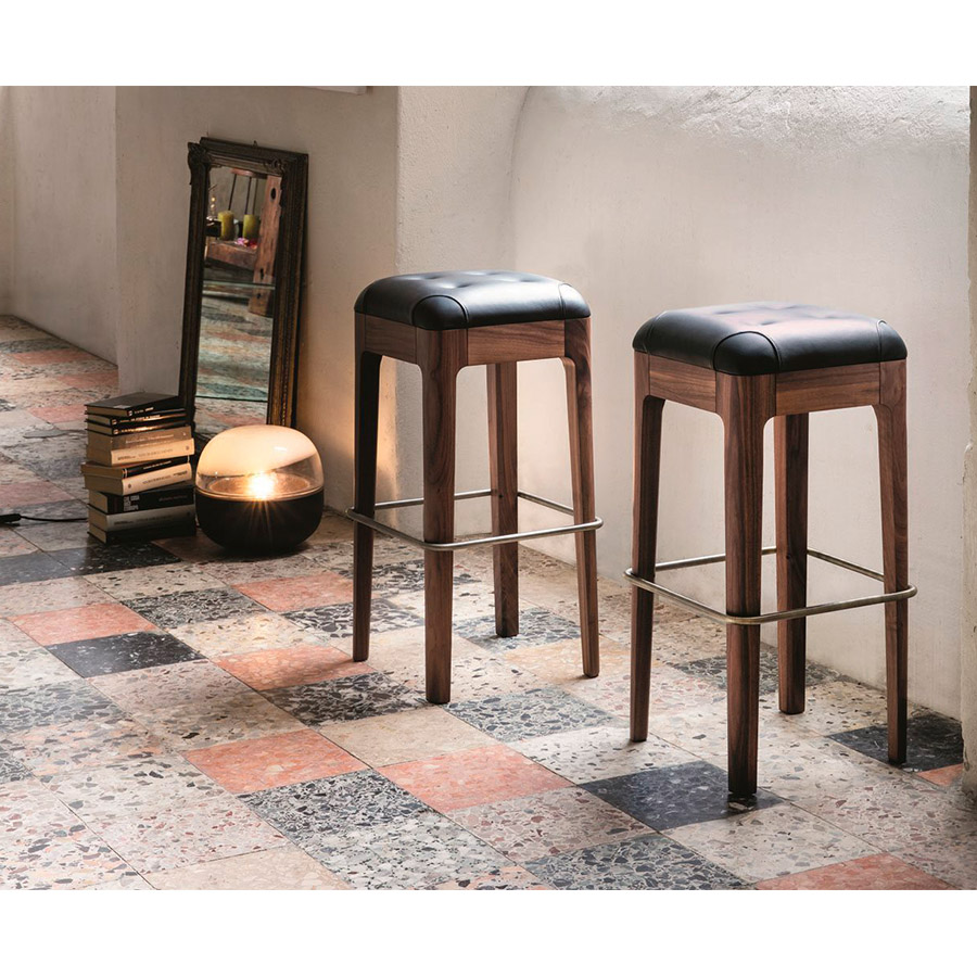 C. BallabioTaburete con estructura en nogal canaletta macizo y asiento con decoración capitoné en las telas de la colección. Descansapiés en acero inoxidable. Posibilidad de pedir los botones en la misma tela del asiento o en contraste.